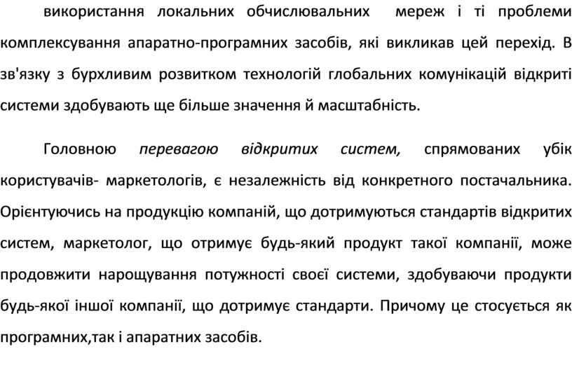 Головною перевагою відкритих систем, спрямованих убік користувачів- маркетологів, є незалежність від конкретного постачальника. Орієнтуючись на продукцію компаній, що дотримуються стандартів відкритих систем, маркетолог, що отримує будь-який продукт такої компанії, може продовжити нарощування потужності своєї системи, здобуваючи продукти будь-якої іншої компанії, що дотримує стандарти. Причому це стосується як програмних,так і апаратних засобів.
