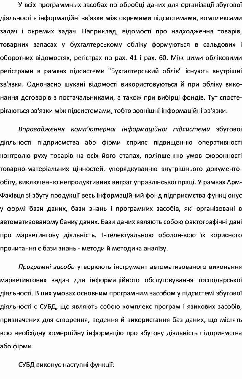 Програмні засоби утворюють інструмент автоматизованого виконання маркетингових задач для інформаційного обслуговування господарської діяльності. В цих умовах основним програмним засобом у підсистемі збутової діяльності є СУБД, що являють собою комплекс програм і язикових засобів, призначених для створення, ведення й використання баз даних, що містять всю необхідну комерційну інформацію про збутову діяльність підприємства або фірми.
