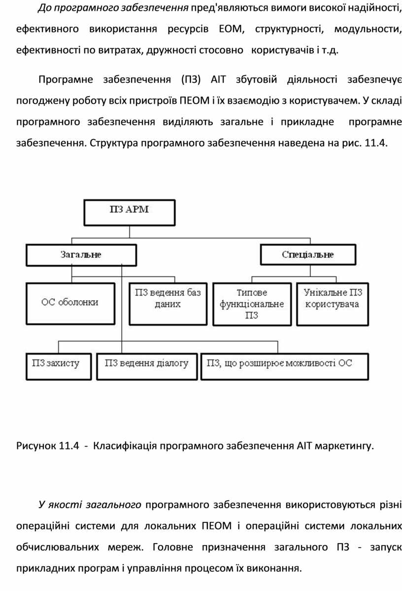 Програмне забезпечення (ПЗ) АІТ збутовій діяльності забезпечує погоджену роботу всіх пристроїв ПЕОМ і їх взаємодію з користувачем. У складі програмного забезпечення виділяють загальне і прикладне програмне забезпечення. Структура програмного забезпечення наведена на рис. 11.4.