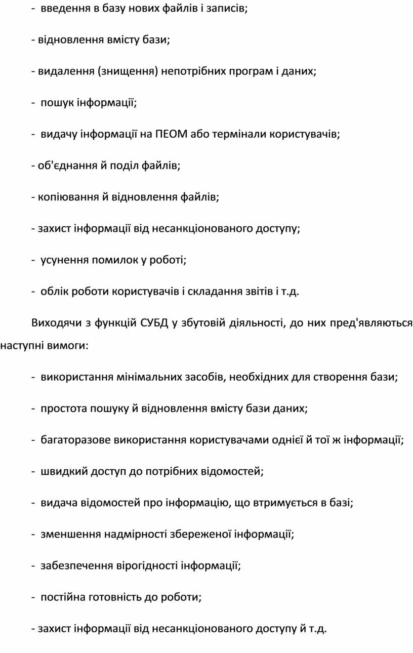 Виходячи з функцій СУБД у збутовій діяльності, до них пред'являються наступні вимоги: