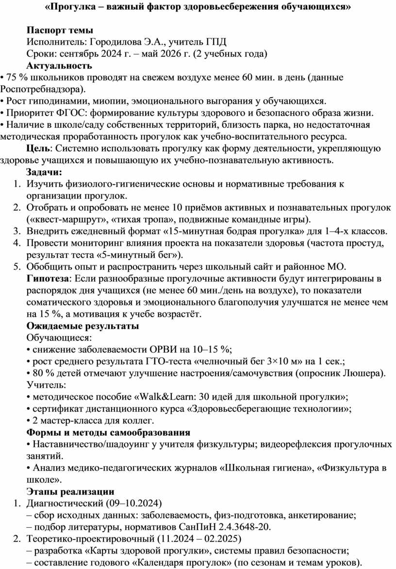 Самообразование по данной теме позволит сделать прогулку не эпизодом, а системной формой сохранения и укрепления здоровья обучающихся, повысит их физическую активность, учебную мотивацию и эмоциональное благополучие