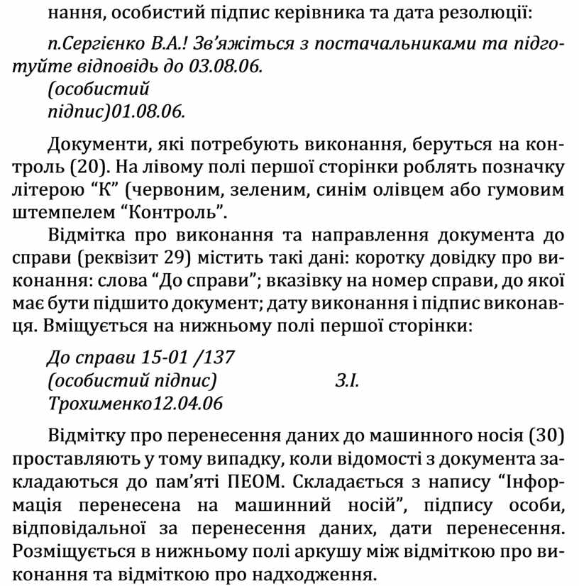 Проходження документів супроводжується відповідними на них позначками. Відмітки ставлять на лицьовій стороні першої сторінки документа, що полегшує сприймання й підви- щує оперативність у роботі. Усі службові відмітки на докумен- тах, які вказують на його проходження та виконання, потрібно обов’язково датувати.