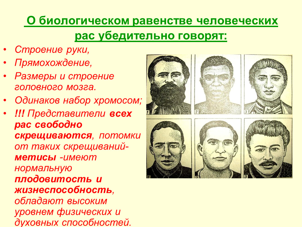 !!! Представители всех рас свободно скрещиваются, потомки от таких скрещиваний- метисы -имеют нормальную плодовитость и жизнеспособность, обладают высоким уровнем физических и духовных способностей.