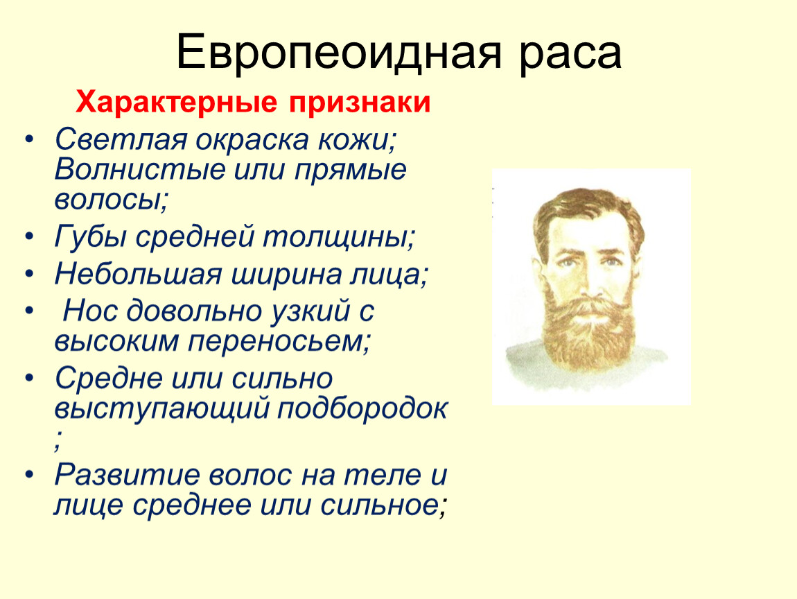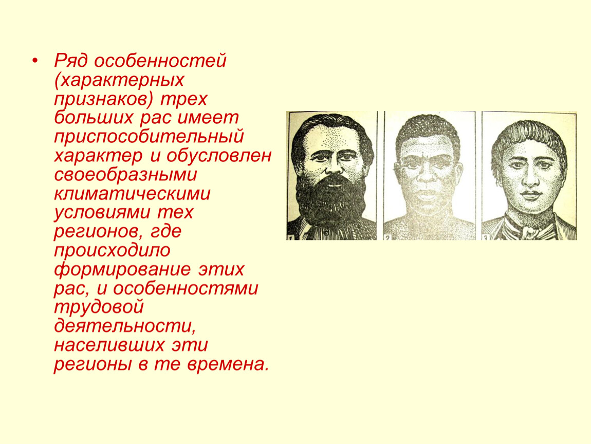 Ряд особенностей (характерных признаков) трех больших рас имеет приспособительный характер и обусловлен своеобразными климатическими условиями тех регионов, где происходило формирование этих рас, и особенностями трудовой деятельности, населивших эти регионы в те времена.