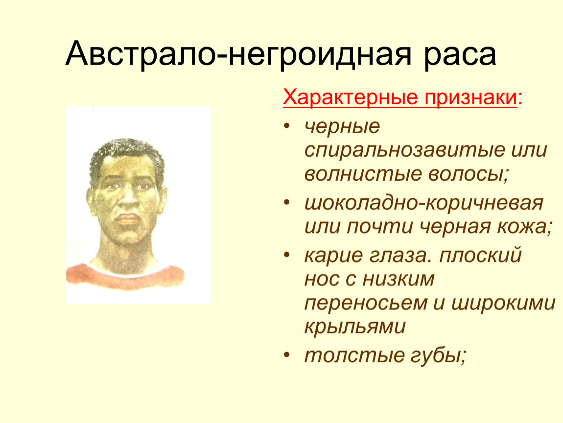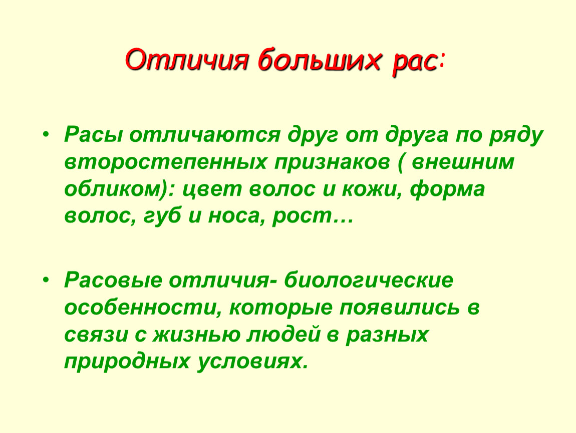 Расы отличаются друг от друга по ряду второстепенных признаков ( внешним обликом): цвет волос и кожи, форма волос, губ и носа, рост…