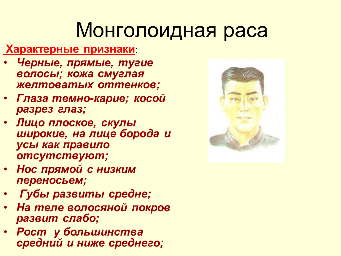 Черные, прямые, тугие волосы; кожа смуглая желтоватых оттенков;