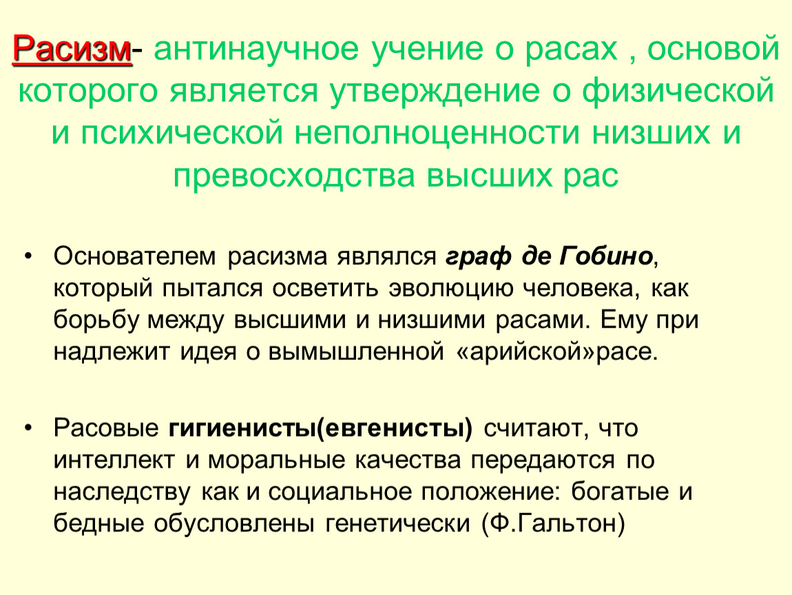 Основателем расизма являлся граф де Гобино, который пытался осветить эволюцию человека, как борьбу между высшими и низшими расами. Ему при надлежит идея о вымышленной «арийской»расе.