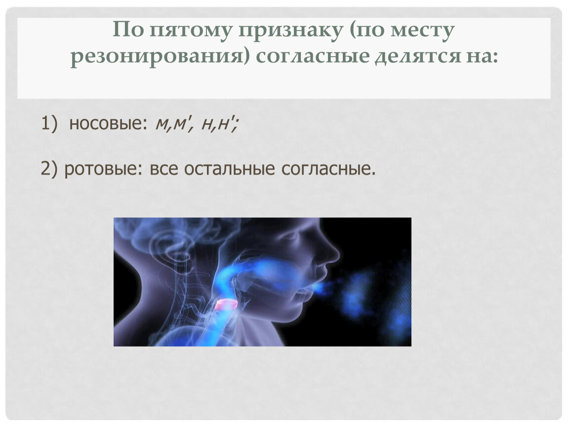 По пятому признаку (по месту резонирования) согласные делятся на: