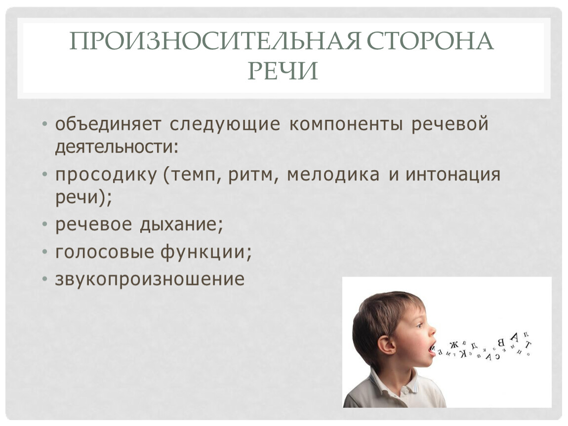 - речевой слух — восприятие соответствующих ситуации темпа и ритма речи;