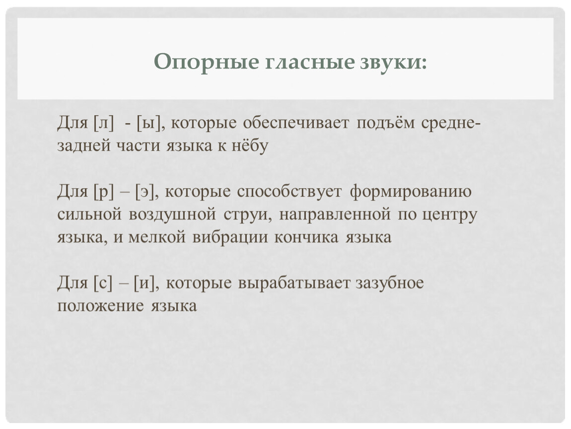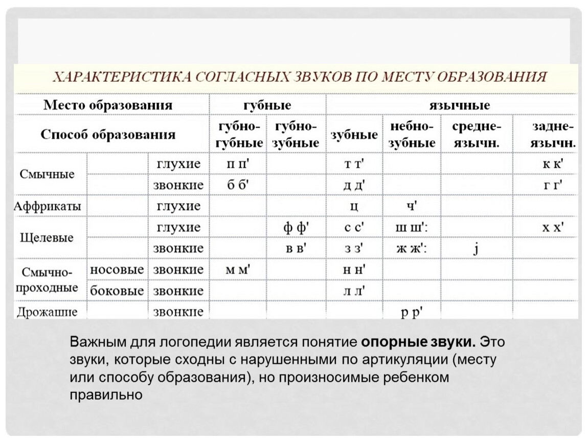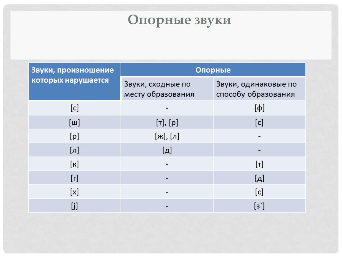 Важным для логопедии является понятие опорные звуки. Это звуки, которые сходны с нарушенными по артикуляции (месту или способу образования), но произносимые ребенком правильно