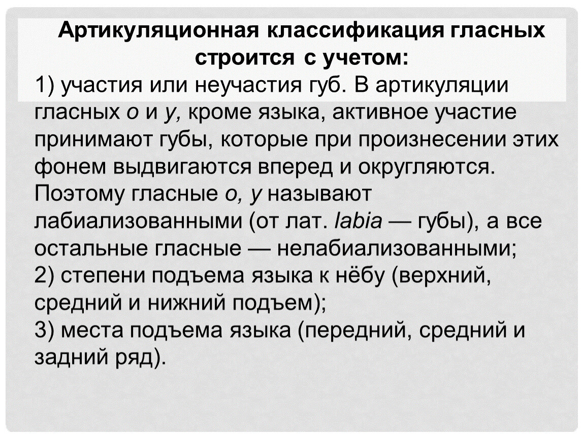 Артикуляционная классификация гласных строится с учетом: