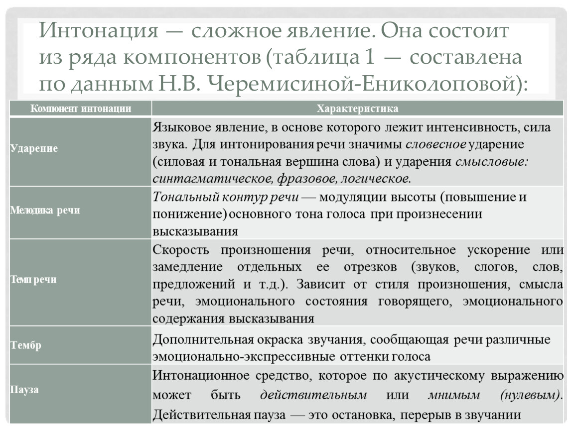 Интонация — сложное явление. Она состоит из ряда компонентов (таблица 1 — составлена по данным Н.В. Черемисиной-Ениколоповой)::