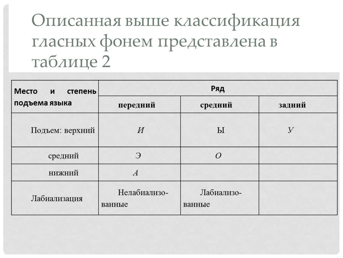 Описанная выше классификация гласных фонем представлена в таблице 2