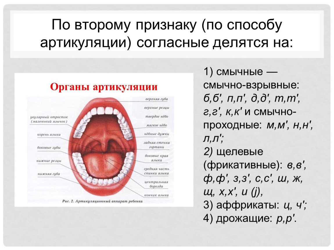 По второму признаку (по способу артикуляции) согласные делятся на:
