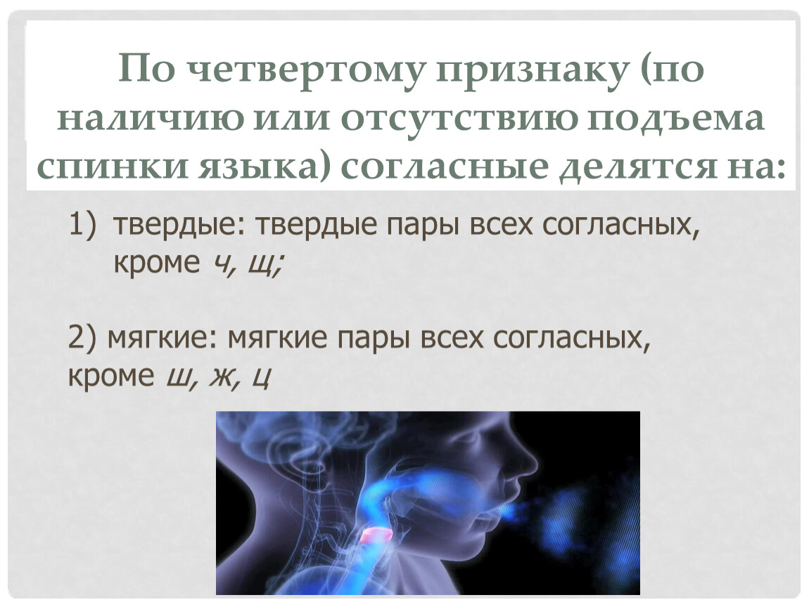 По четвертому признаку (по наличию или отсутствию подъема спинки языка) согласные делятся на:
