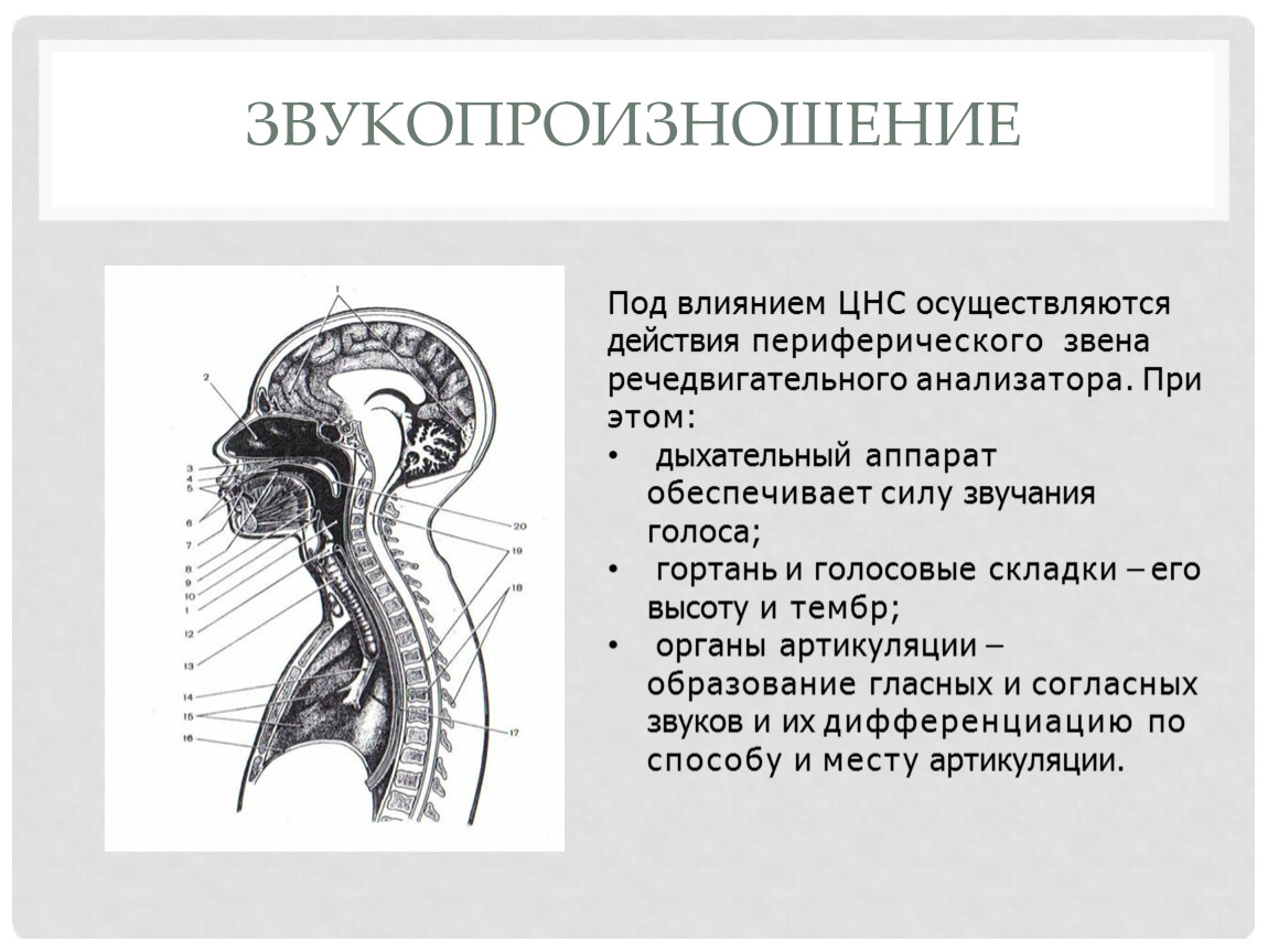 процесс образования речевых звуков, осуществляемый энергетическим, генераторным и резонаторным отделами речевого аппарата при регуляции со стороны центральной
