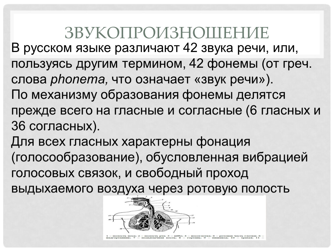 В русском языке различают 42 звука речи, или, пользуясь другим термином, 42 фонемы (от греч. слова phonema, что означает «звук речи»).