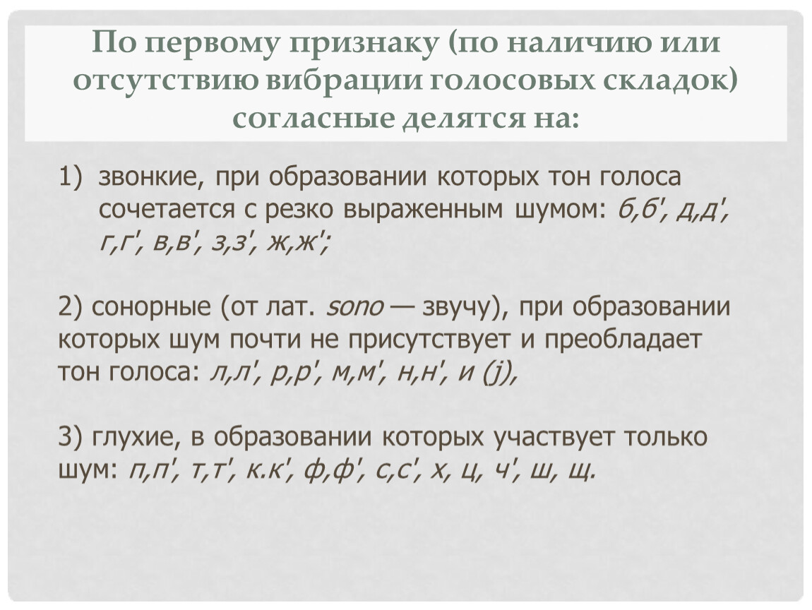 2) сонорные (от лат. sono — звучу), при образовании которых шум почти не присутствует и преобладает тон голоса: л,л', р,р', м,м', н,н', и (j),