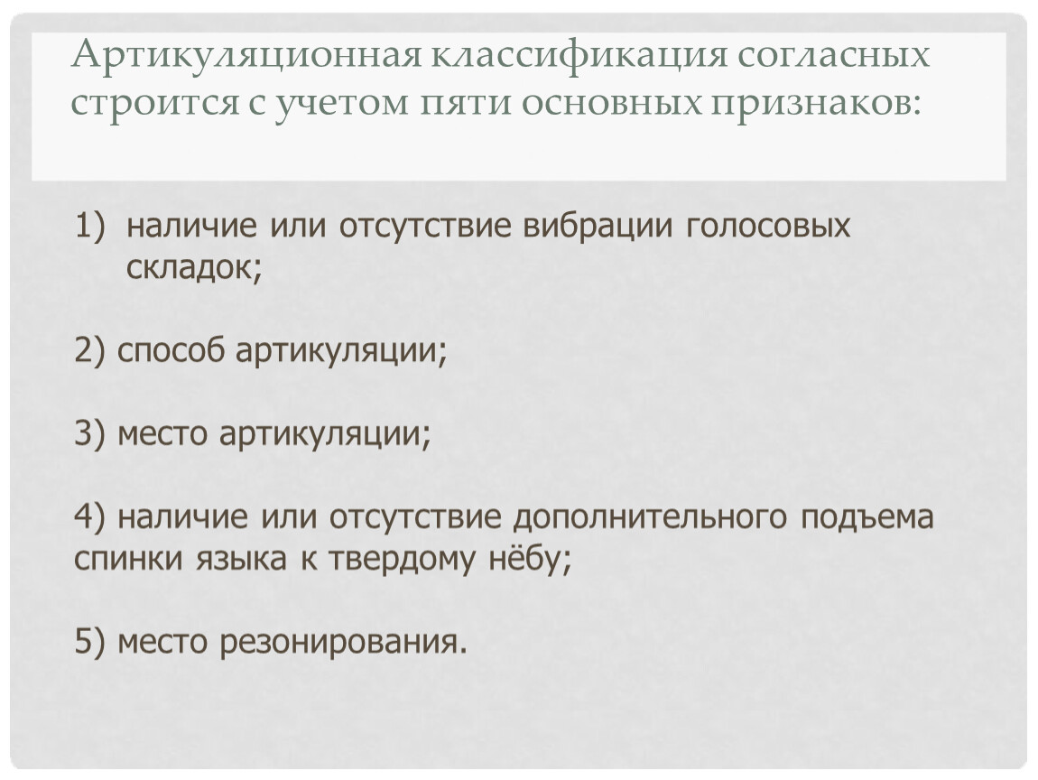 Артикуляционная классификация согласных строится с учетом пяти основных признаков: