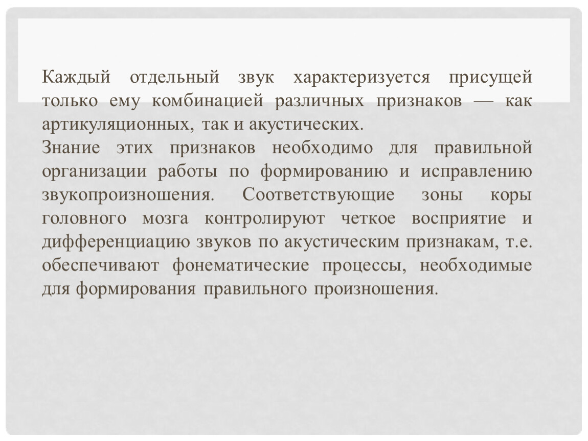Знание этих признаков необходимо для правильной организации работы по формированию и исправлению звукопроизношения. Соответствующие зоны коры головного мозга контролируют четкое восприятие и дифференциацию звуков по акустическим признакам, т.е. обеспечивают фонематические процессы, необходимые для формирования правильного произношения.