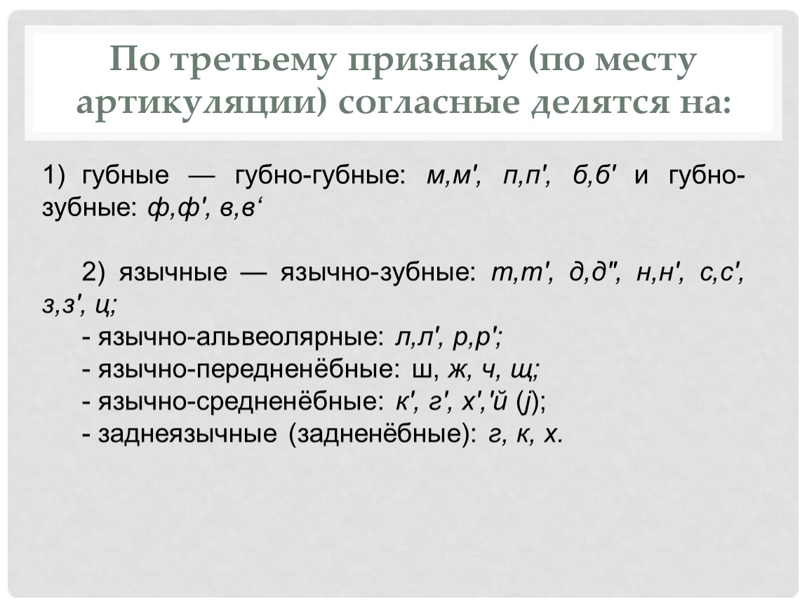 По третьему признаку (по месту артикуляции) согласные делятся на:
