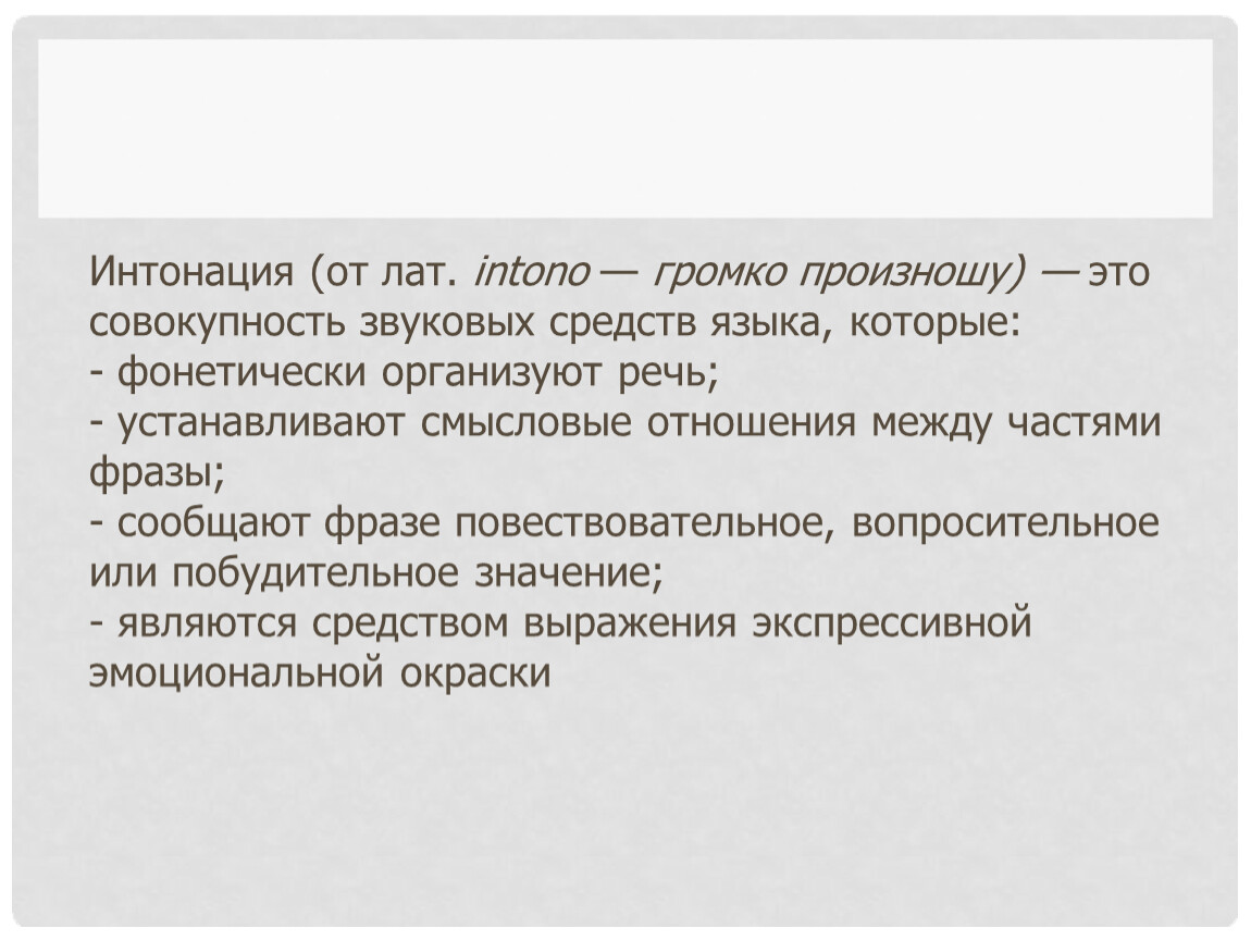 Интонация (от лат. intono — громко произношу) — это совокупность звуковых средств языка, которые: