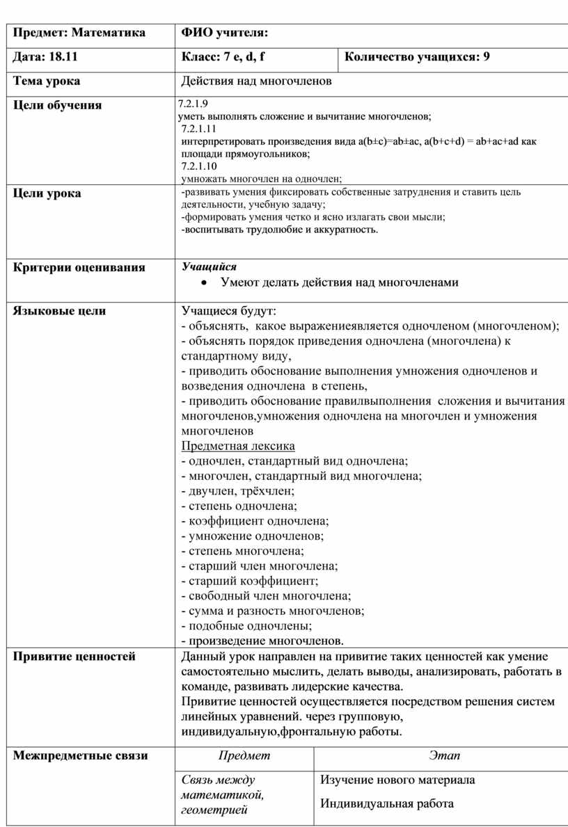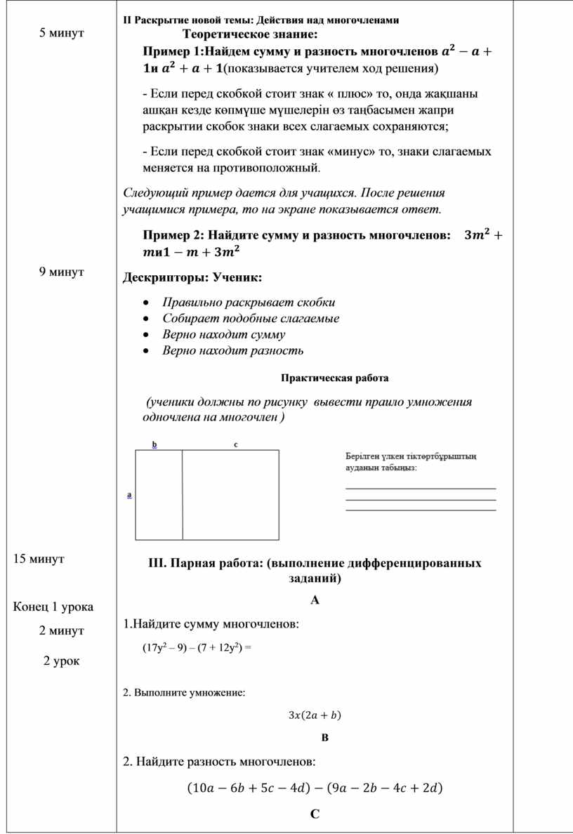7.2.1.9 уметь выполнять сложение и вычитание многочленов; 7.2.1.11 интерпретировать произведения вида a(b±c)=ab±ac, a(b+c+d) = ab+ac+ad как площади прямоугольников; 7.2.1.10 умножать многочлен на одночлен; |