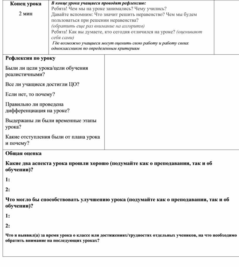 Общая оценка Какие два аспекта урока прошли хорошо (подумайте как о преподавании, так и об обучении)? 1: 2: Что могло бы способствовать улучшению урока (подумайте как о преподавании, так и об обучении)? 1: 2: Что я выявил(а) за время урока о классе или достижениях/трудностях отдельных учеников, на что необходимо обратить внимание на последующих уроках?