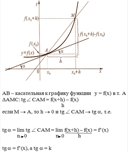 В самом деле, для любой функции y=f (x) в системе координат, в её области определения можно построить график. Если взять значение на оси абсцисс то, в соответствие этому значению можно найти на графике значение функции. В этой точке также может быть построена касательная, образующая с положительным направлением оси абсцисс угол α такой, что