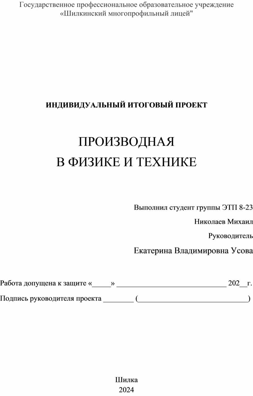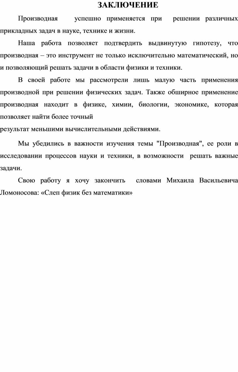 Наша работа позволяет подтвердить выдвинутую гипотезу, что производная – это инструмент не только исключительно математический, но и позволяющий решать задачи в области физики и техники.