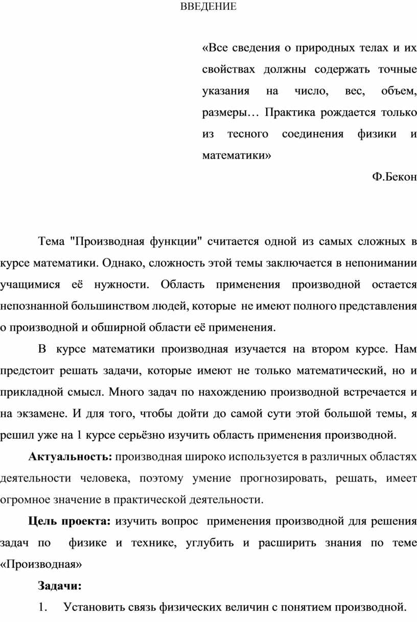 Цель проекта: изучить вопрос применения производной для решения задач по физике и технике, углубить и расширить знания по теме «Производная»
