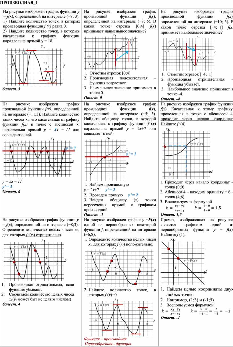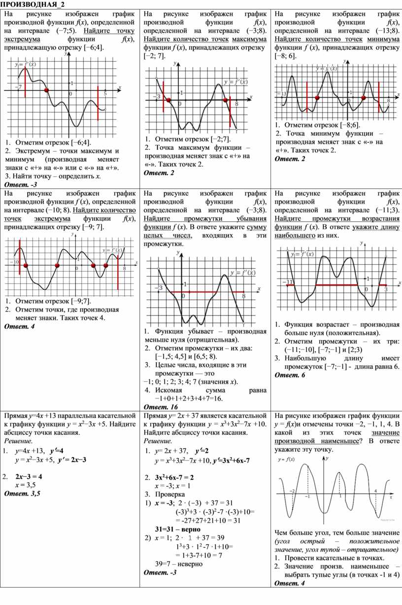 Чем больше угол, тем больше значение (угол острый – положительное значение, угол тупой – отрицательное) 1. Провести касательные в точках. 2. Значение произв. наименьшее – выбрать тупые углы (в точках -1 и 4) Ответ. 4 |