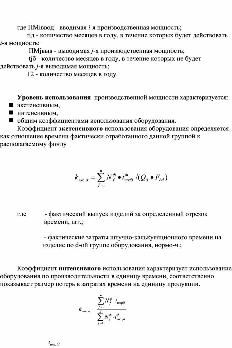 Коэффициент интенсивного использования характеризует использование оборудования по производительности в единицу времени, соответственно показывает размер потерь в затратах времени на единицу продукции.