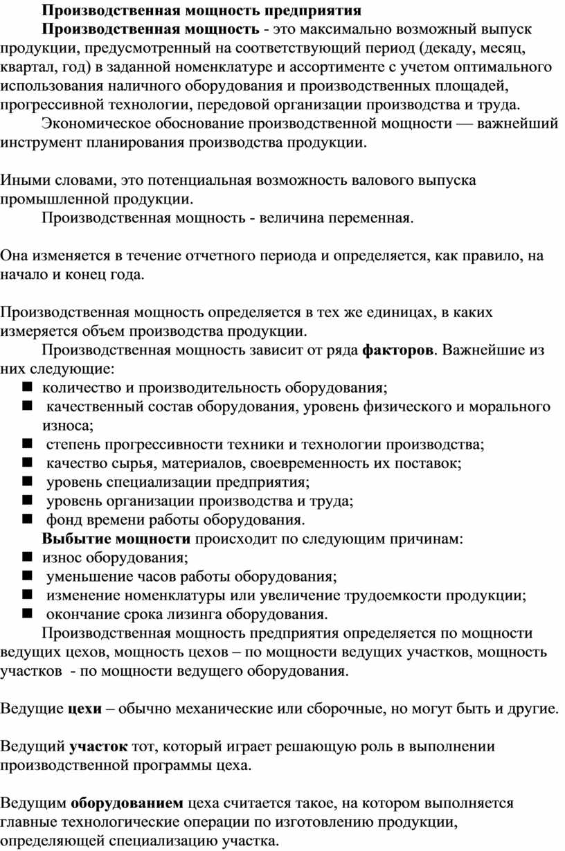Производственная мощность - это максимально возможный выпуск продукции, предусмотренный на соответствующий период (декаду, месяц, квартал, год) в заданной номенклатуре и ассортименте с учетом оптимального использования наличного оборудования и производственных площадей, прогрессивной технологии, передовой организации производства и труда.