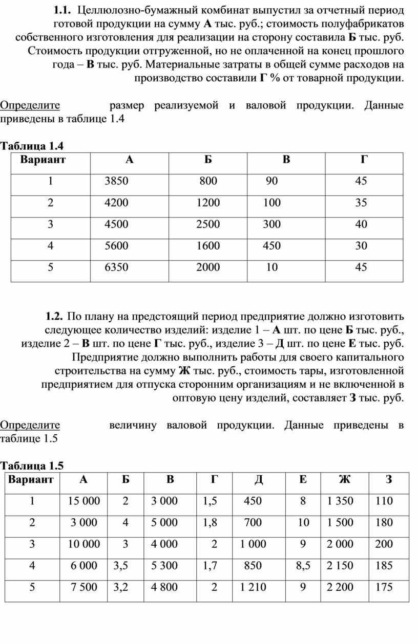 1.4. Целлюлозно-бумажный комбинат выпустил за отчетный период готовой продукции на сумму А тыс. руб.; стоимость полуфабрикатов собственного изготовления для реализации на сторону составила Б тыс. руб. Стоимость продукции отгруженной, но не оплаченной на конец прошлого года – В тыс. руб. Материальные затраты в общей сумме расходов на производство составили Г % от товарной продукции.