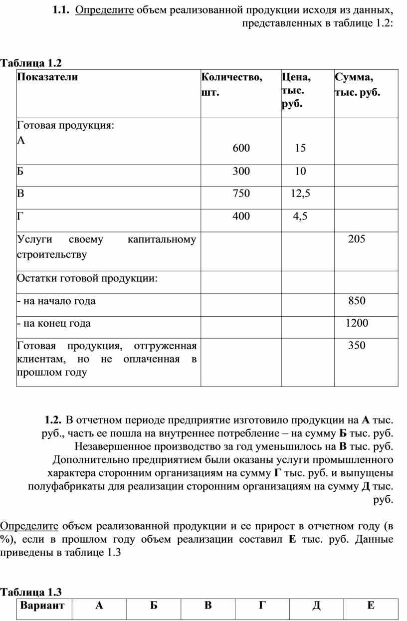 1.2. Определите объем реализованной продукции исходя из данных, представленных в таблице 1.2: