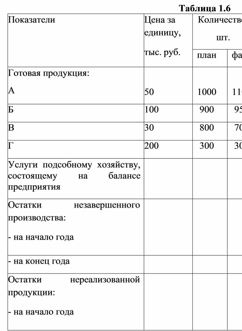 1.3. В отчетном периоде предприятие изготовило продукции на А тыс. руб., часть ее пошла на внутреннее потребление – на сумму Б тыс. руб. Незавершенное производство за год уменьшилось на В тыс. руб. Дополнительно предприятием были оказаны услуги промышленного характера сторонним организациям на сумму Г тыс. руб. и выпущены полуфабрикаты для реализации сторонним организациям на сумму Д тыс. руб.