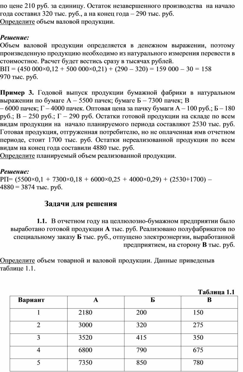 1.1. В отчетном году на целлюлозно-бумажном предприятии было выработано готовой продукции А тыс. руб. Реализовано полуфабрикатов по специальному заказу Б тыс. руб., отпущено электроэнергии, выработанной предприятием, на сторону В тыс. руб.