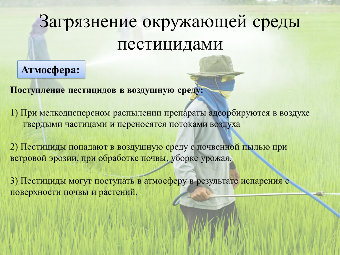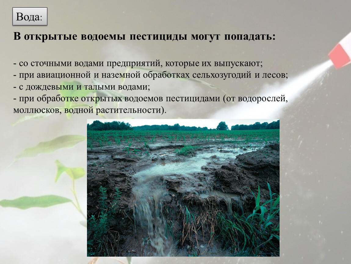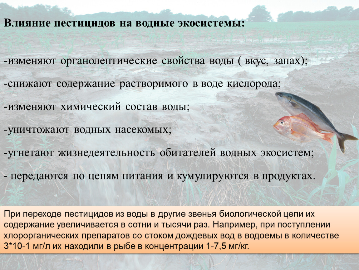 При переходе пестицидов из воды в другие звенья биологической цепи их содержание увеличивается в сотни и тысячи раз. Например, при поступлении хлорорганических препаратов со стоком дождевых вод в водоемы в количестве 3*10-1 мг/л их находили в рыбе в концентрации 1-7,5 мг/кг.