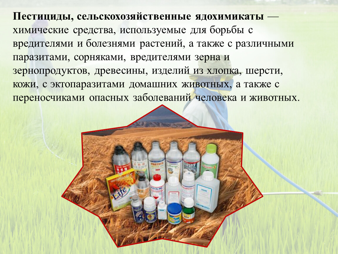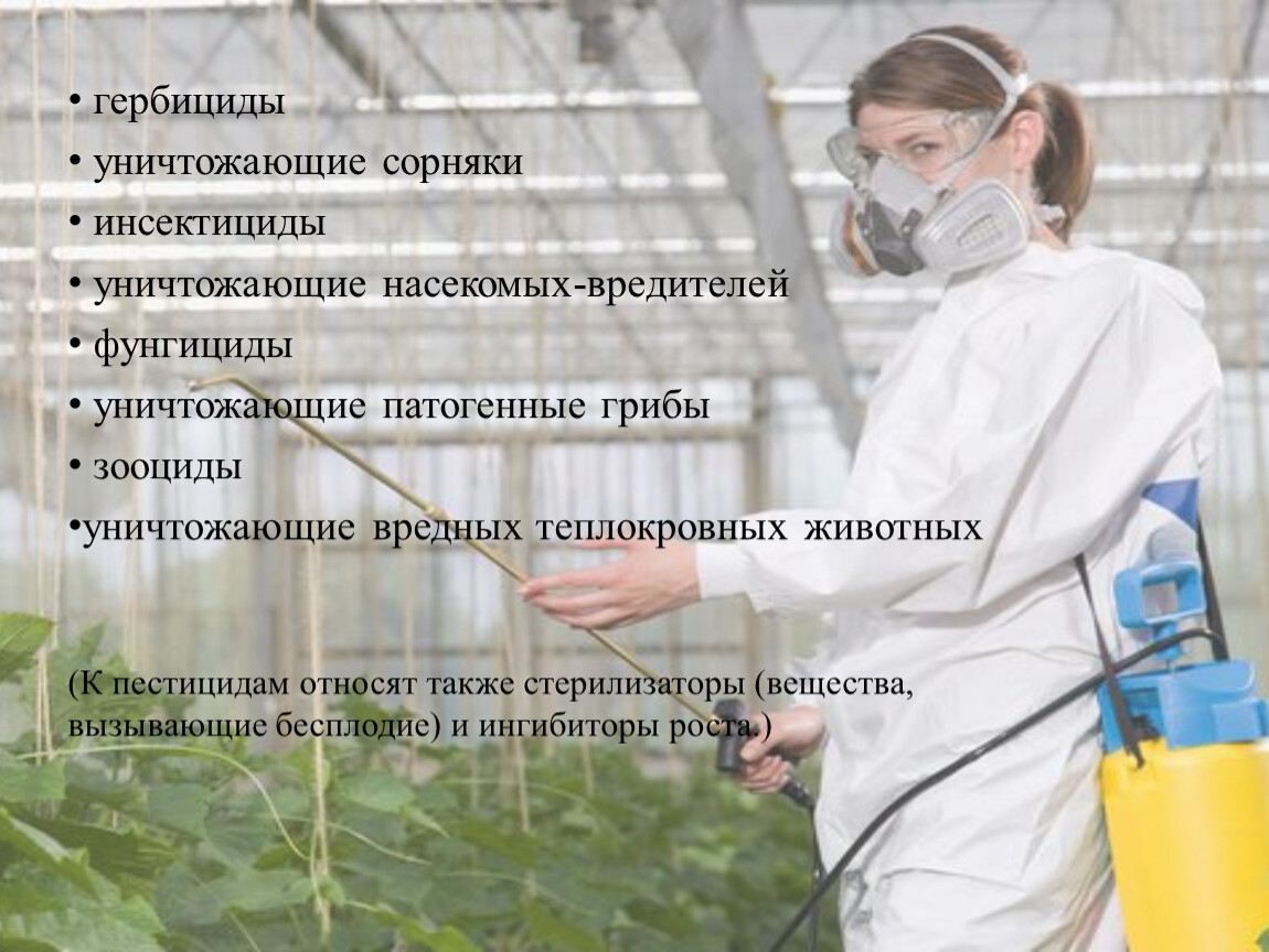 (К пестицидам относят также стерилизаторы (вещества, вызывающие бесплодие) и ингибиторы роста.)