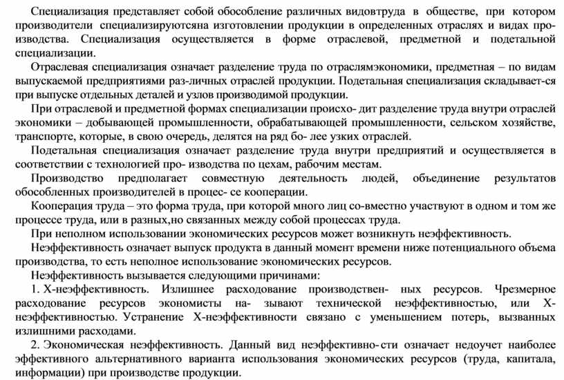 Специализация представляет собой обособление различных видов труда в обществе, при котором производители специализируются на изготовлении продукции в определенных отраслях и видах про- изводства. Специализация осуществляется в форме отраслевой, предметной и подетальной специализации.