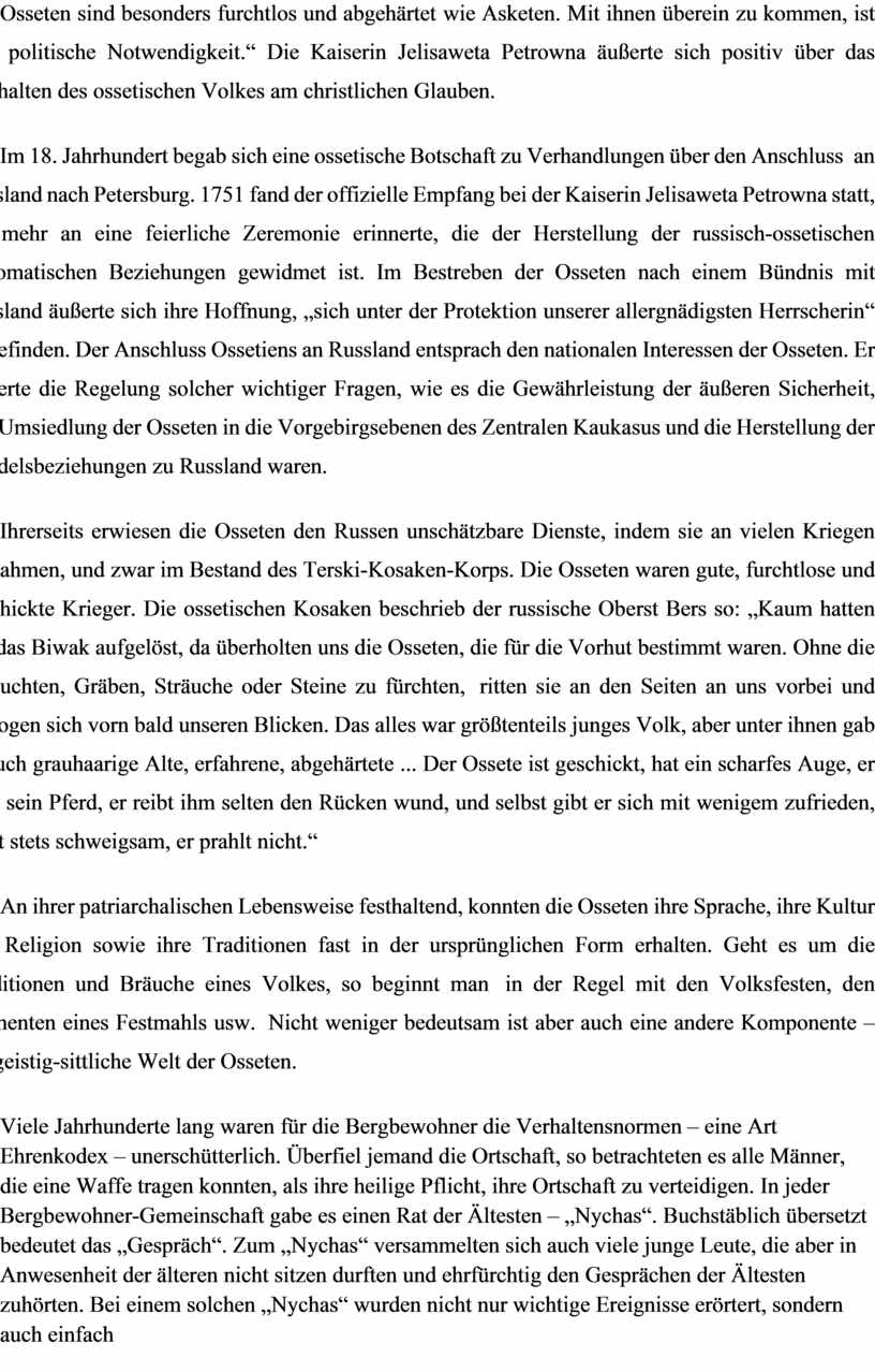 An ihrer patriarchalischen Lebensweise festhaltend, konnten die Osseten ihre Sprache, ihre Kultur und Religion sowie ihre Traditionen fast in der ursprünglichen Form erhalten. Geht es um die Traditionen und Bräuche eines Volkes, so beginnt man in der Regel mit den Volksfesten, den Elementen eines Festmahls usw. Nicht weniger bedeutsam ist aber auch eine andere Komponente – die geistig-sittliche Welt der Osseten.