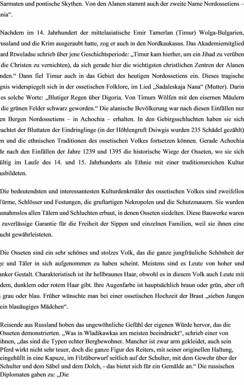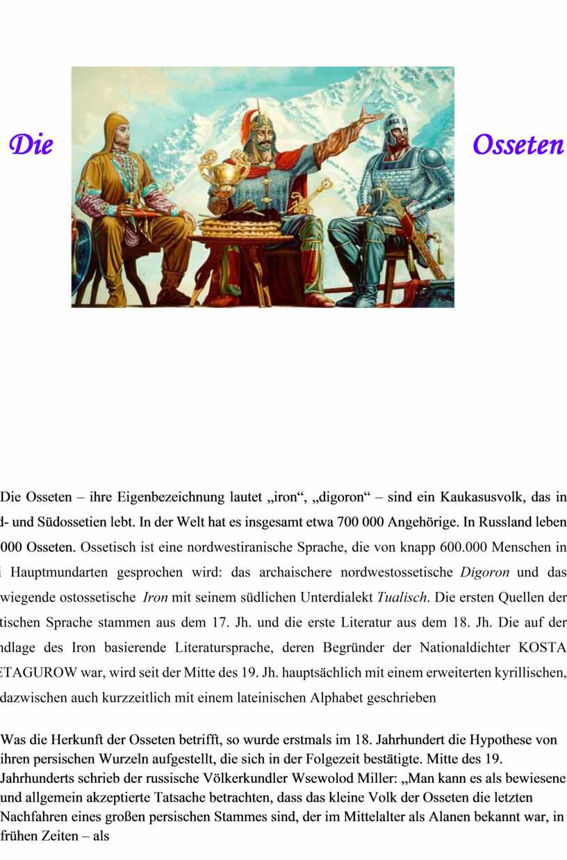 Die Osseten – ihre Eigenbezeichnung lautet „iron“, „digoron“ – sind ein Kaukasusvolk, das in Nord- und Südossetien lebt. In der Welt hat es insgesamt etwa 700 000 Angehörige. In Russland leben 515 000 Osseten. Ossetisch ist eine nordwestiranische Sprache, die von knapp 600.000 Menschen in zwei Hauptmundarten gesprochen wird: das archaischere nordwestossetische Digoron und das überwiegende ostossetische Iron mit seinem südlichen Unterdialekt Tualisch. Die ersten Quellen der ossetischen Sprache stammen aus dem 17. Jh. und die erste Literatur aus dem 18. Jh. Die auf der Grundlage des Iron basierende Literatursprache, deren Begründer der Nationaldichter KOSTA CHETAGUROW war, wird seit der Mitte des 19. Jh. hauptsächlich mit einem erweiterten kyrillischen, und dazwischen auch kurzzeitlich mit einem lateinischen Alphabet geschrieben