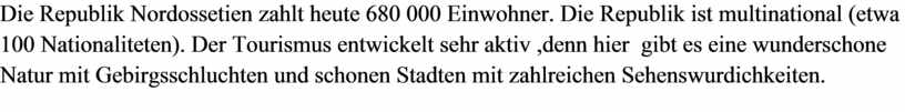 Die Republik Nordossetien zahlt heute 680 000 Einwohner. Die Republik ist multinational (etwa 100 Nationaliteten). Der Tourismus entwickelt sehr aktiv ,denn hier gibt es eine wunderschone Natur mit Gebirgsschluchten und schonen Stadten mit zahlreichen Sehenswurdichkeiten.