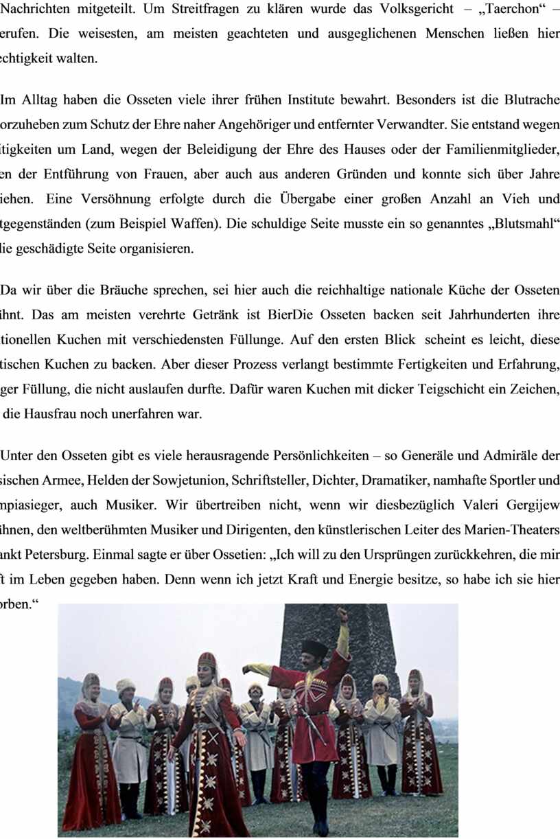 Unter den Osseten gibt es viele herausragende Persönlichkeiten – so Generäle und Admiräle der Russischen Armee, Helden der Sowjetunion, Schriftsteller, Dichter, Dramatiker, namhafte Sportler und Olympiasieger, auch Musiker. Wir übertreiben nicht, wenn wir diesbezüglich Valeri Gergijew erwähnen, den weltberühmten Musiker und Dirigenten, den künstlerischen Leiter des Marien-Theaters in Sankt Petersburg. Einmal sagte er über Ossetien: „Ich will zu den Ursprüngen zurückkehren, die mir Kraft im Leben gegeben haben. Denn wenn ich jetzt Kraft und Energie besitze, so habe ich sie hier erworben.“