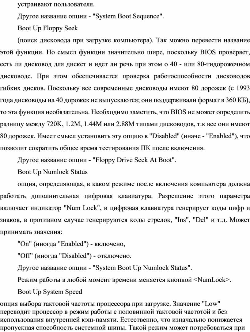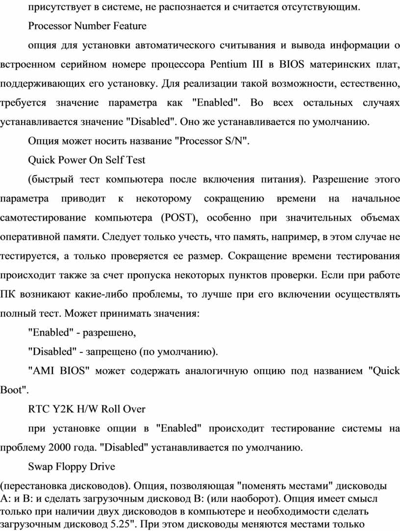 (быстрый тест компьютера после включения питания). Разрешение этого параметра приводит к некоторому сокращению времени на начальное самотестирование компьютера (POST), особенно при значительных объемах оперативной памяти. Следует только учесть, что память, например, в этом случае не тестируется, а только проверяется ее размер. Сокращение времени тестирования происходит также за счет пропуска некоторых пунктов проверки. Если при работе ПК возникают какие-либо проблемы, то лучше при его включении осуществлять полный тест. Может принимать значения: