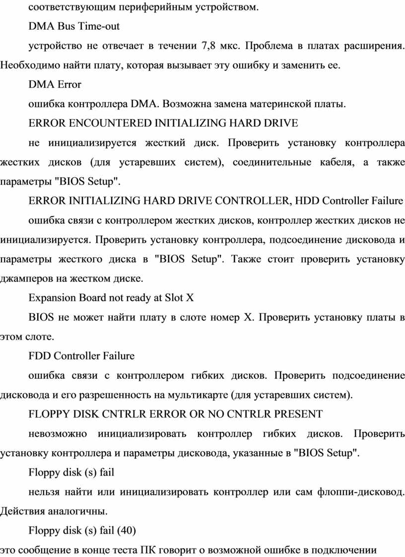 ошибка связи с контроллером жестких дисков, контроллер жестких дисков не инициализируется. Проверить установку контроллера, подсоединение дисковода и параметры жесткого диска в "BIOS Setup". Также стоит проверить установку джамперов на жестком диске.