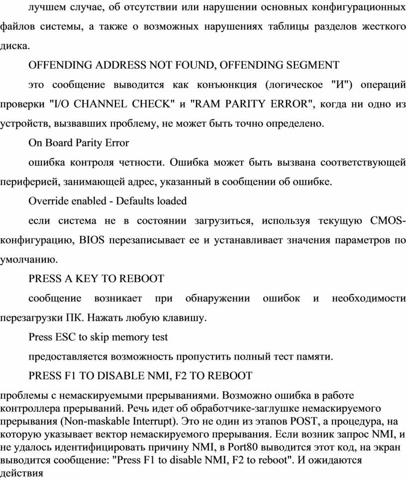 ошибка контроля четности при тестировании адреса ХХХХ. Если память поддерживает контроль четности, то требуется ее замена.