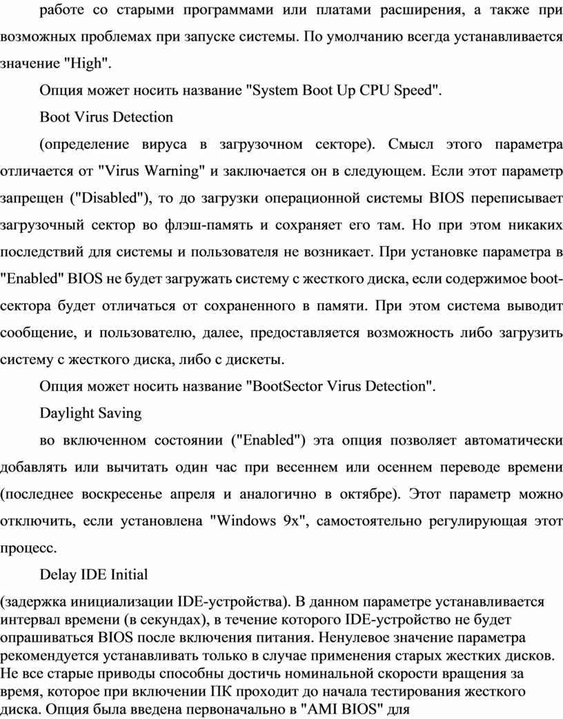 (задержка инициализации IDE-устройства). В данном параметре устанавливается интервал времени (в секундах), в течение которого IDE-устройство не будет опрашиваться BIOS после включения питания. Ненулевое значение параметра рекомендуется устанавливать только в случае применения старых жестких дисков. Не все старые приводы способны достичь номинальной скорости вращения за время, которое при включении ПК проходит до начала тестирования жесткого диска. Опция была введена первоначально в "AMI BIOS" для использования старых накопителей и позднее была оставлена для совместимости.