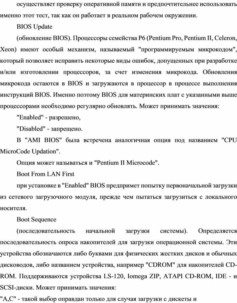 (обновление BIOS). Процессоры семейства P6 (Pentium Pro, Pentium II, Celeron, Xeon) имеют особый механизм, называемый "программируемым микрокодом", который позволяет исправить некоторые виды ошибок, допущенных при разработке и/или изготовлении процессоров, за счет изменения микрокода. Обновления микрокода остаются в BIOS и загружаются в процессор в процессе выполнения инструкций BIOS. Именно поэтому BIOS для материнских плат с указанными выше процессорами необходимо регулярно обновлять. Может принимать значения: